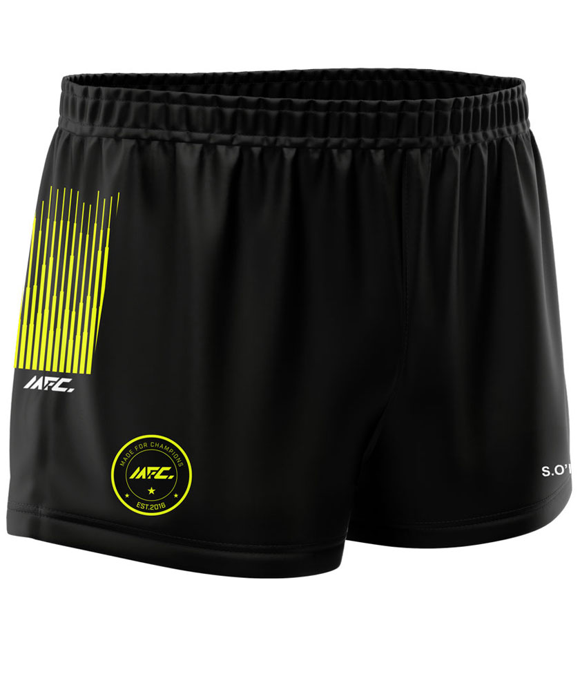 MFC Shorts are custom-made to feature your club crest, sponsor logo, initials, and colours.