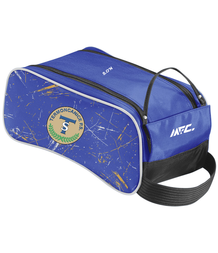 The MFC Boot Bag is custom-made to feature your school crest, sponsor logo, and initials. With parallel zips that run along the top of the boot bag, a pull tab for ease of use on the zips, which aid both to open at the same time, a closure flap secured with hook and loop Velcro.