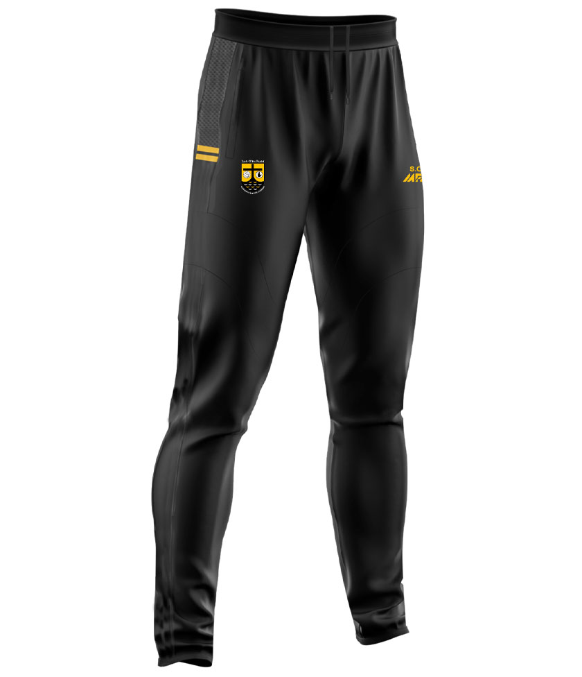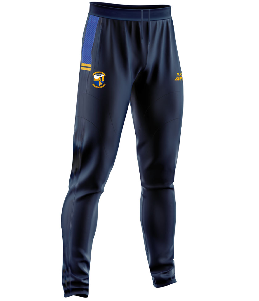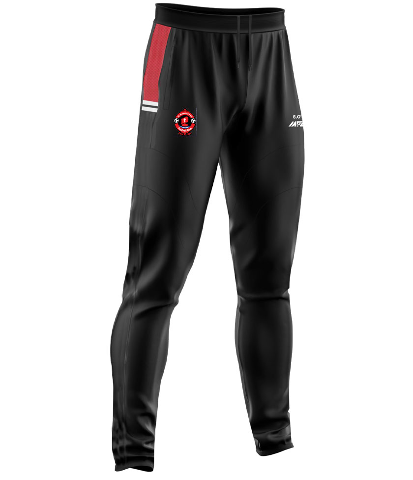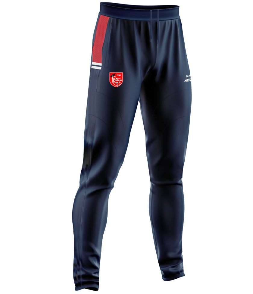 They feature a flat elasticated waistband with an adjustable drawcord, allowing for a customisable fit. Two practical side zip pockets offer secure storage, while the outer leg zips at the ankle add a touch of detail and functionality. The distinctive MFC branding adds a signature touch, completing the look with a stylish finish.