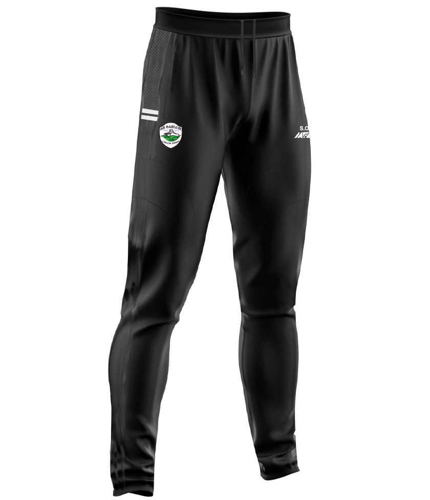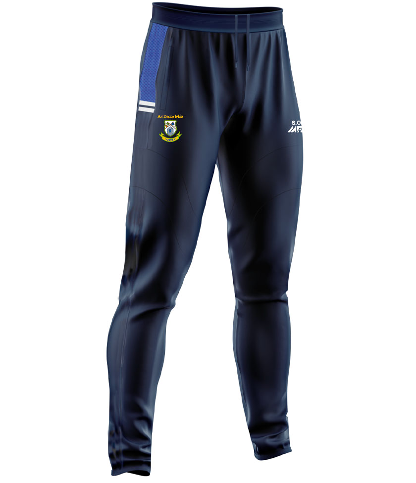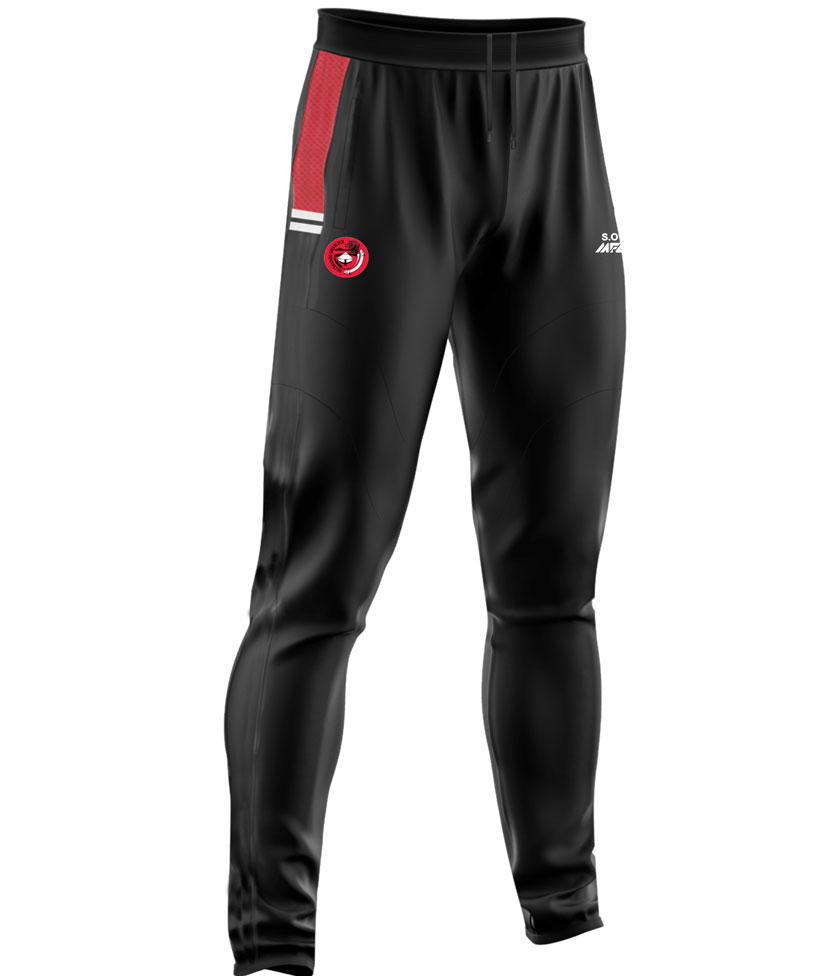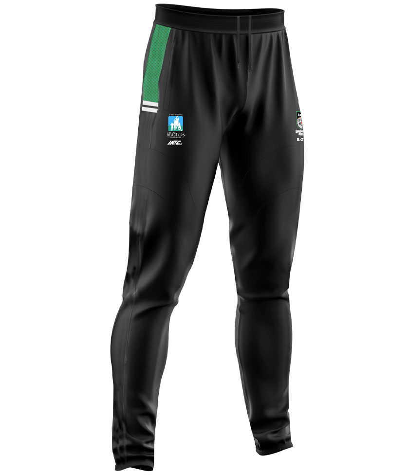 They feature a flat elasticated waistband with an adjustable drawcord, allowing for a customisable fit. Two practical side zip pockets offer secure storage, while the outer leg zips at the ankle add a touch of detail and functionality. The distinctive MFC branding adds a signature touch, completing the look with a stylish finish.